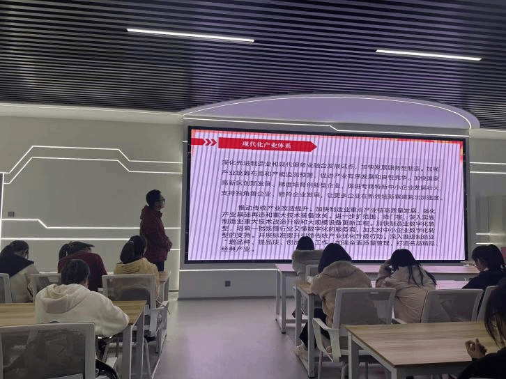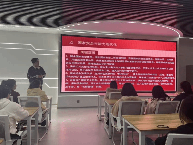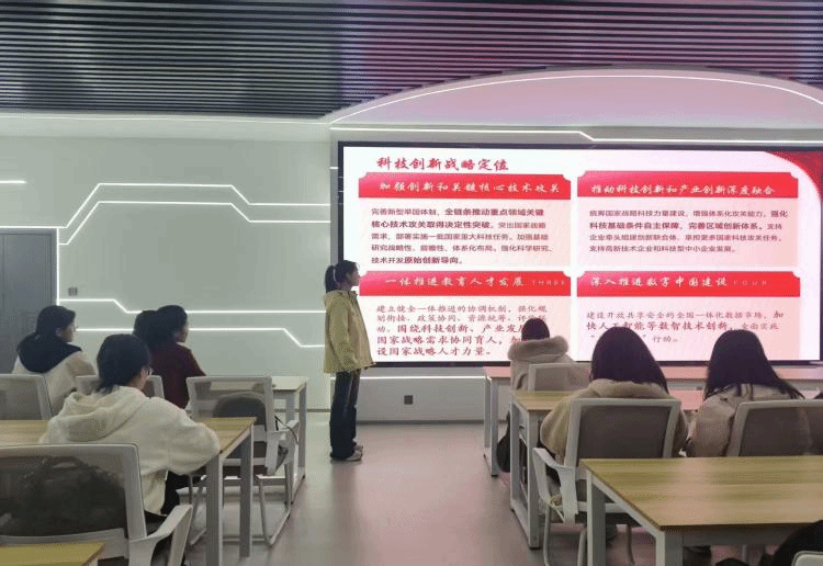 王瑾琪首先以全会通过的《十五五规划建议》为核心,从“十四五”时期经济、科技领域的重大成就切入,系统阐释 “十五五规划” 七大发展目标与“六个坚持”原则;然后结合经济回升案例,强调“全面从严治党是根本保障”,点明党的领导对事业发展的关键作用;最后呼吁同学们深刻认识全会战略意义,将个人成长规划与社会主义现代化国家蓝图紧密结合。