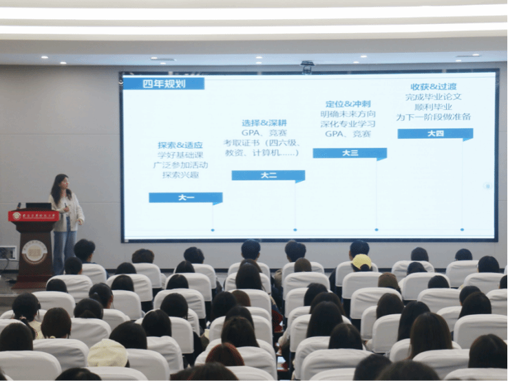2025级毕业生学生代表刘怡江则从“长期规划”视角分享经验。她以本科时期的成长为例,建议新生尽早明确目标:若计划考研,需从大一起夯实专业基础,关注学科前沿动态,利用图书馆资源阅读经典文献;若考虑就业,可通过实习提前了解行业需求,学院组织的公务员备考讲座、企业宣讲会都是宝贵机会。她鼓励新生遇到困惑及时与辅导员沟通,“大学的每一次试错都是成长,重要的是保持积极心态,一步一个脚印实现目标”。