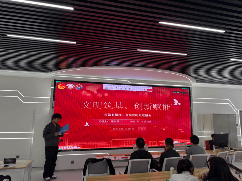 在标兵宿舍答辩中,各宿舍代表通过成员介绍、思想与学风建设、学业成绩、科研竞赛及志愿活动等内容,充分彰显了宿舍这个小集体的良好氛围。宿舍虽小,却是立德树人的重要阵地。温馨和谐的宿舍环境,不仅为生活添彩,更为成员的个人成长与集体发展注入了持久活力。