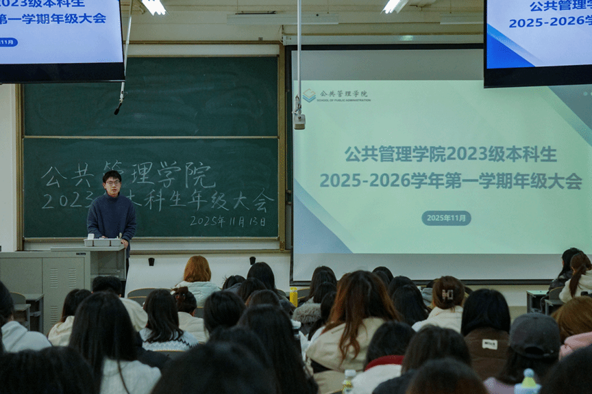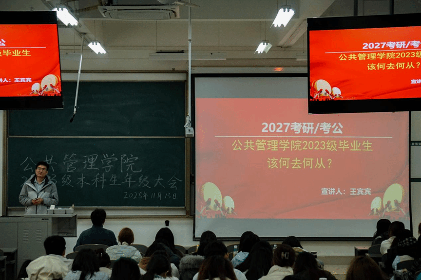 为帮助2023级本科生理清发展方向,确立奋斗目标,科学规划人生路径,公共管理学院于2025年11月13日中午在学府城8-206召开2023级本科生年级大会,学院科研办范妍老师、尚研教育王宾宾老师出席本次会议,全体2023级本科生参加会议。本次会议由2023级本科生辅导员吴佳城主持。