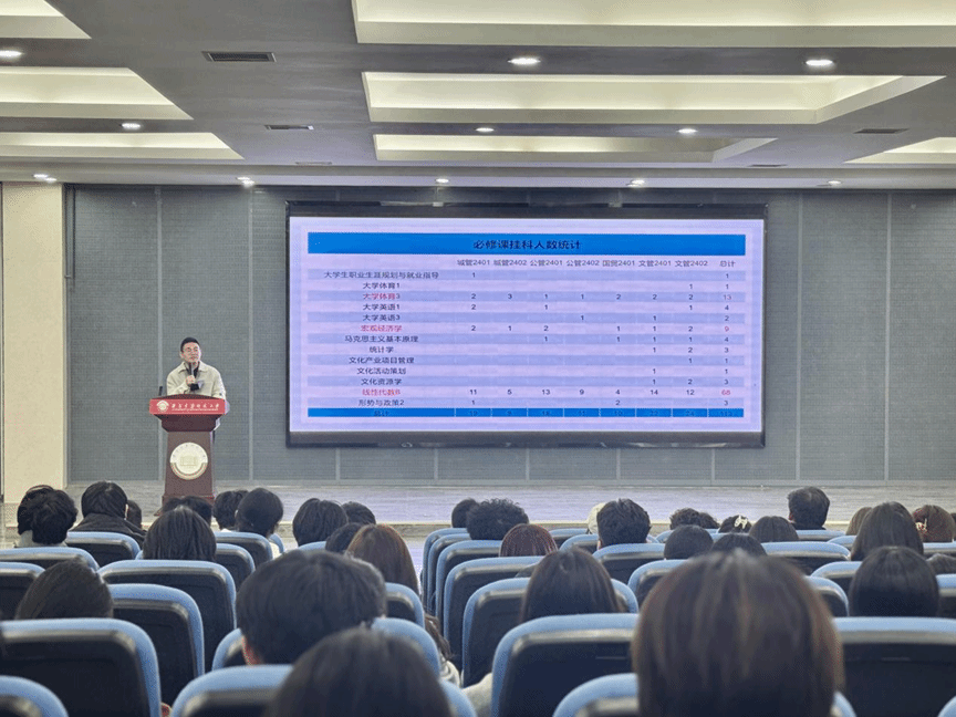 学业分析明短板。会议伊始,强靖淇以详实数据为支撑,全面分析了年级整体学业情况,重点通报各班挂科率、必修课挂科率及选修课旷考等问题,并对部分同学申请缓考后未及时关注审批结果的情况提出严肃提醒。同时,他结合各班GPA排名及变化趋势,引导同学们正视学业短板、明确改进方向。