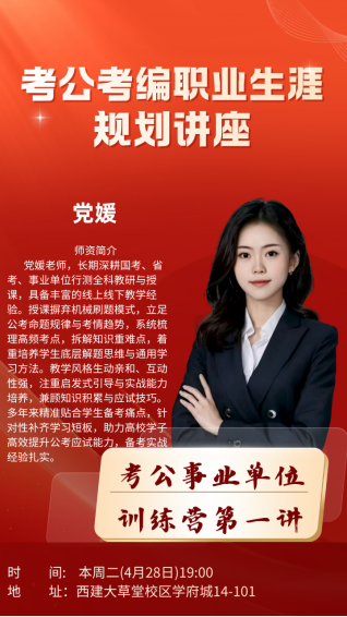 为帮助学生明晰就业方向、科学规划职业路径、精准把握考公考编备考节奏,引导低年级有公考意向的同学提前规划、夯实基础,4月28日晚,西安建筑科技大学公共管理学院考公事业单位训练营首场讲座在草堂校区14-101教室成功举办。本次讲座特邀中公教育专业讲师党媛主讲。