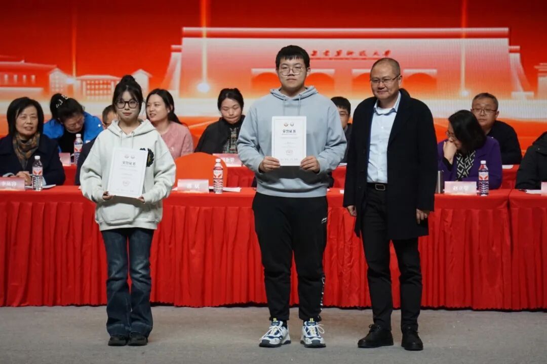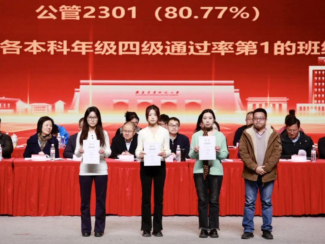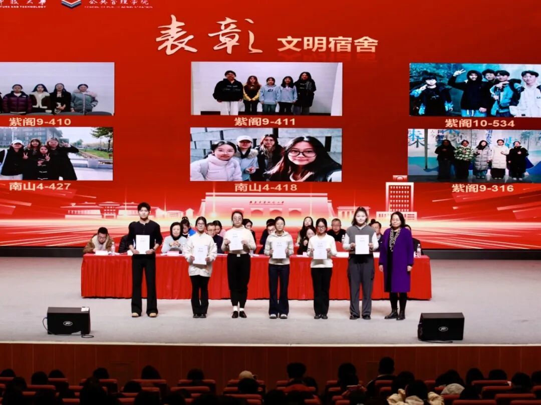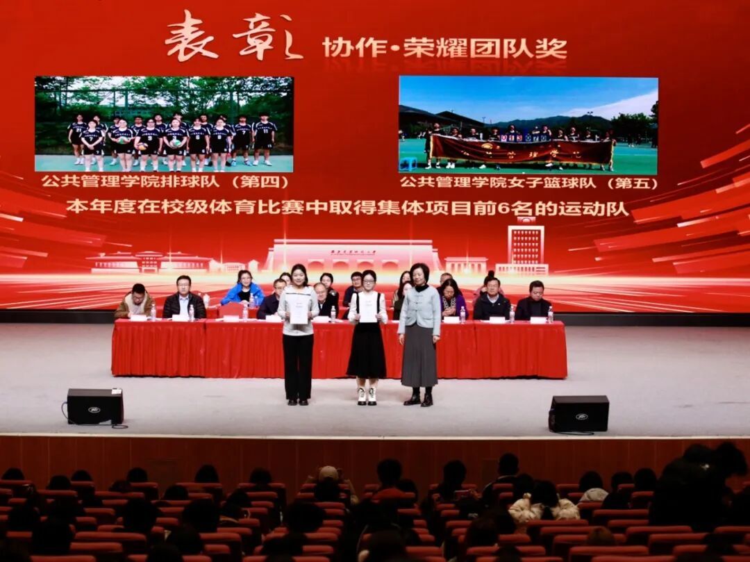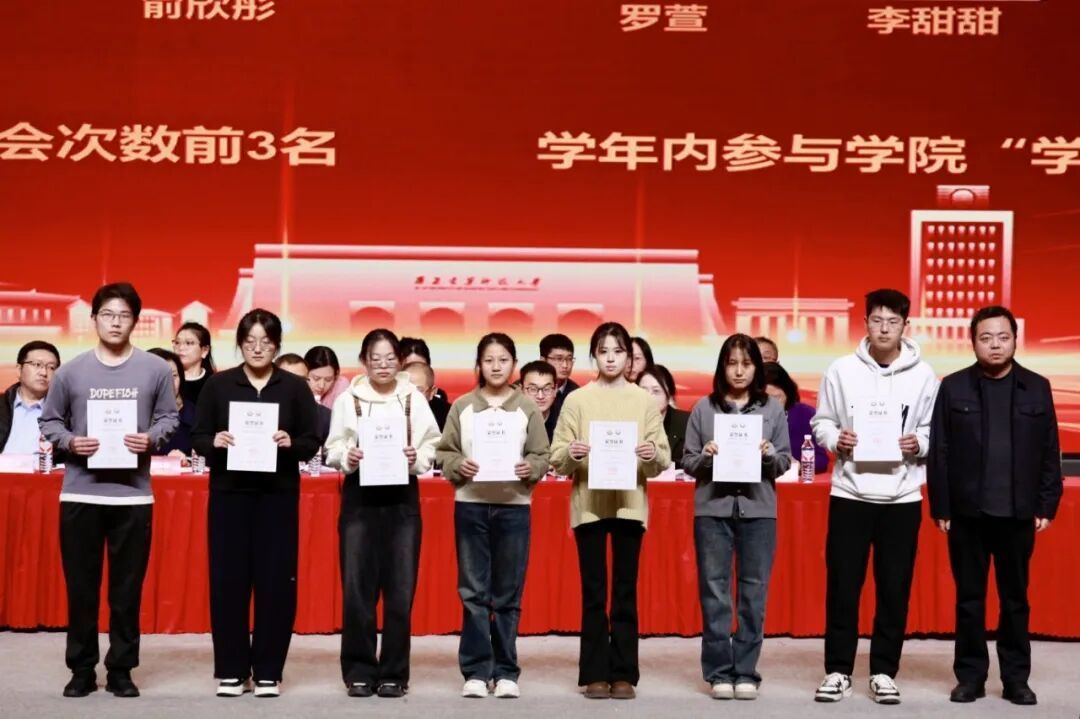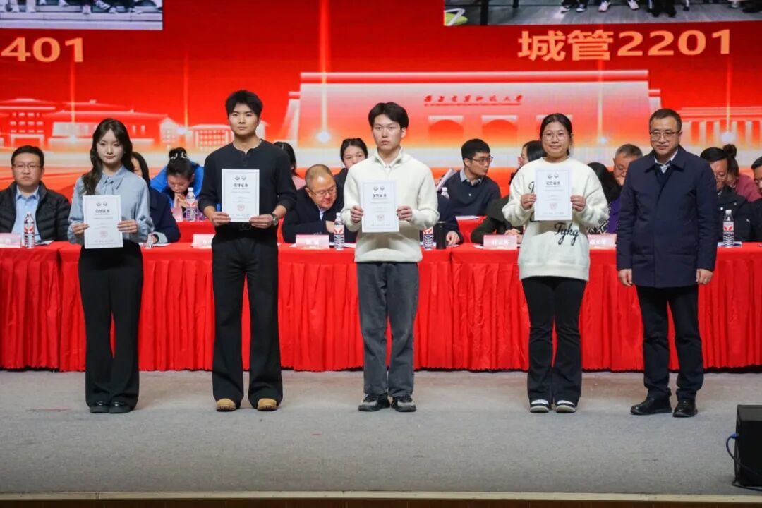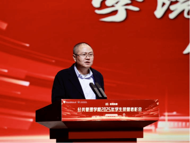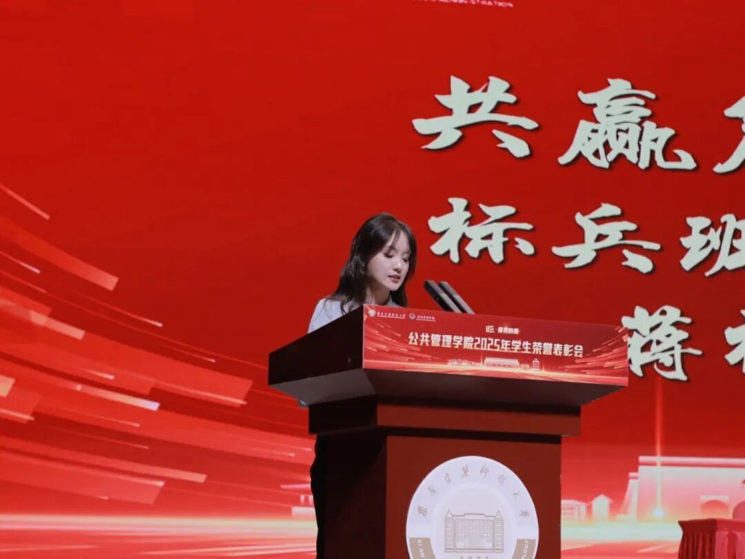 公共管理学院党委书记郭斌,党委副书记、副院长庞传涛,副院长方永恒、任云英,各系教师代表及各办公室负责人,全体班主任、辅导员,先进集体及个人代表,2024级与2025级全体本科生、2025级全体研究生,以及2023级部分学生代表共同参会。大会由院团委书记刘楠主持。学院师生齐聚一堂,一同分享收获的喜悦,共话未来的期许。表彰会以“笃行、精进、协作、共赢”为核心脉络,通过表彰先进、经验分享的形式,全方位展现了公管学子在学业、实践、集体生活中的亮眼成绩。