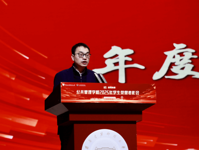 表彰会在庄严的国歌声中拉开序幕。庞传涛作2025年度学生工作报告。他系统回顾了过去一年学院在思想引领、学风建设、校园文化、就业指导与队伍建设五大领域取得的丰硕成果,指出学生工作始终锚定立德树人根本任务,扎实推进,成效显著。在肯定成绩的同时,庞传涛特别赞扬了同学们在日常中闪耀的“笃行、精进、协作、共赢”四种光芒,强调表彰不仅是对成果的肯定,更是对奋斗过程的铭记。最后,他寄语全体师生在2026年新征程上,以饱满热情和务实作风凝心聚力,为学校“11445”发展新格局贡献公管力量。
