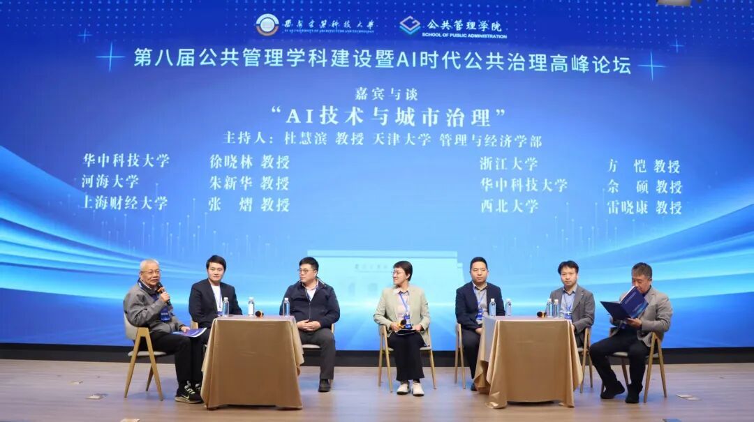 嘉宾与谈环节以“AI技术与城市治理”为主题,由天津大学杜慧滨教授担任主持人。湖南农业大学徐晓林教授、华中科技大学佘硕教授、浙江大学方恺教授、河海大学朱新华教授、上海财经大学张熠教授以及西北大学雷晓康教授围绕新一代信息技术如何重塑治理模式、AI技术在城市治理中的应用与挑战进行了热烈而深刻的讨论。