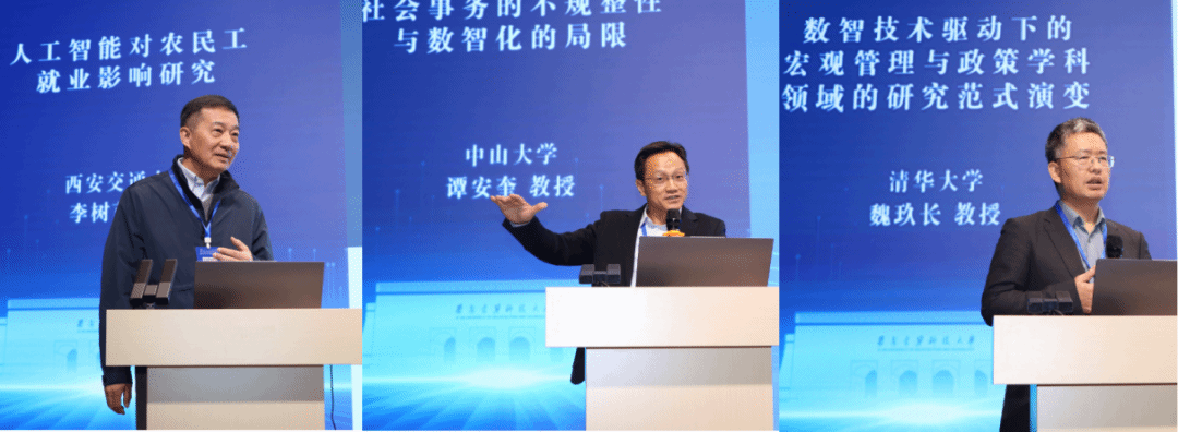第一阶段主旨报告由公共管理学院副院长方永恒教授主持。西安交通大学李树茁教授围绕“人工智能对农民工就业影响研究”进行分享。中山大学谭安奎教授以“社会事务的不规整性与数智化的局限”为题进行了深入探讨。清华大学魏玖长教授聚焦“数智技术驱动下的宏观管理与政策学科领域的研究范式演变”展开论述。