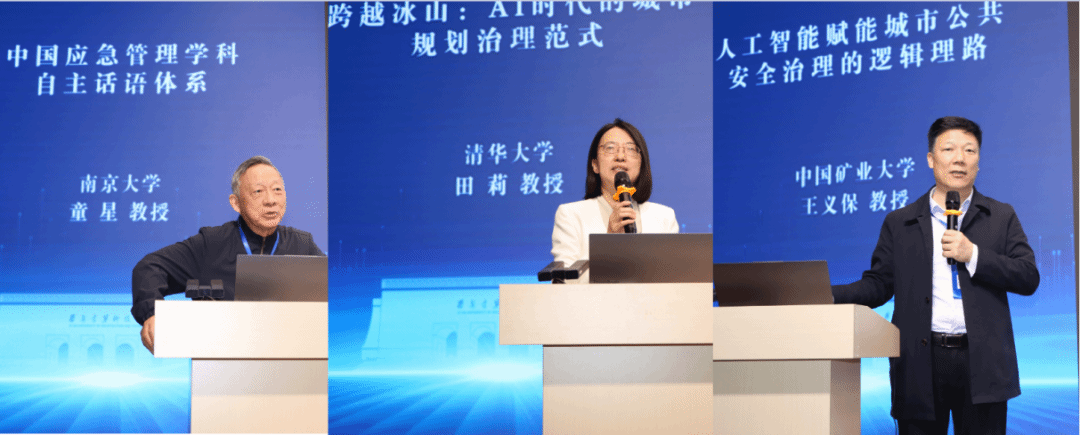 第二阶段主旨报告由公共管理学院王文彬教授主持。南京大学童星教授以“中国应急管理学科自主话语体系”为题发表演讲。清华大学田莉教授分享了“跨越冰山:AI时代的城市规划治理范式”。中国矿业大学王义保教授探讨了“人工智能赋能城市公共安全治理的逻辑理路”。