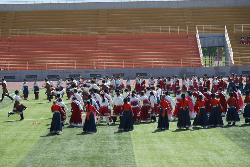 鼓点轻扬,欢歌启幕,公管学子踏风而来,以灵动之姿勾勒家园盛景。舞蹈队员与动物扮演者从两侧翩跹登场,全体成员向舞台中央集结,身影错落间,满是生机与欢喜。扇影轻摇,如春风拂过林海;队形流转,似溪流奔涌山间,大波浪队形徐徐舒展,将自然的灵动与蓬勃演绎得淋漓尽致。随后,众人围拢成圈,同心圆队形缓缓开合,锅庄舞的节奏轻快跃动,大家与“动物伙伴”携手共舞,篝火旁的身影紧紧相依,每一个舞步都藏着万物共生的温情,每一次转身都映着家园和乐的美好。这片土地的生机,也正是公共管理学院与三江源生态保护基金会,携手守护的初心——用科研与公益,为高原撑起一片可持续发展的蓝天。